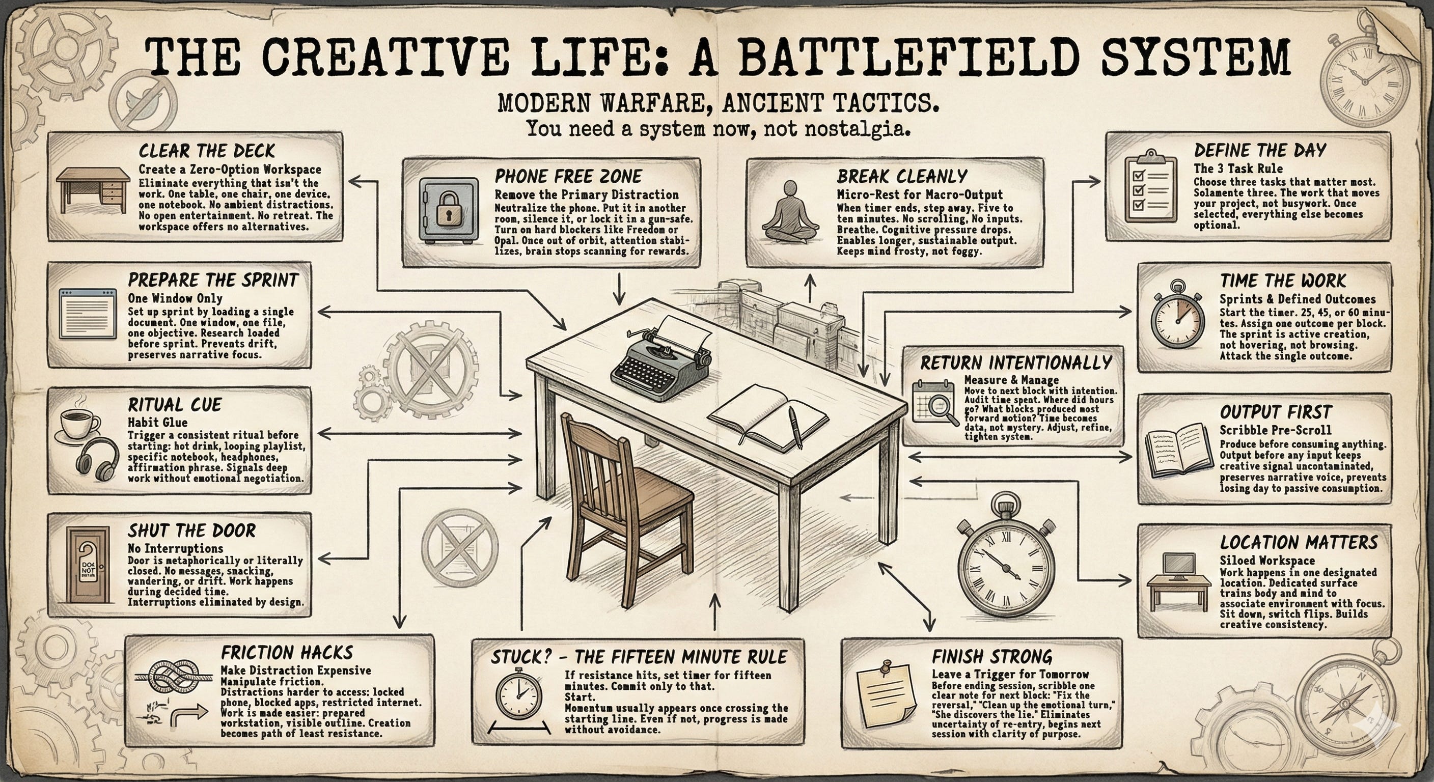Modern creative life is a battlefield of pop-ups, notifications, alerts, ambient noise, and algorithmic intrusions. You need a system now, not nostalgia. What follows is a collection of hard-edged productivity habits with proven deep-work systems from high-output creators, filmmakers, programmers, novelists, and academics.