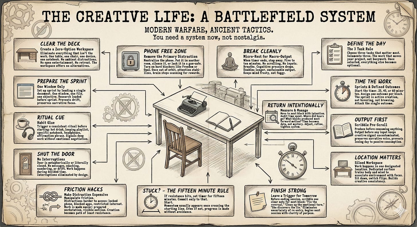 This playbook creates a protected space where uninterrupted thinking can happen. It gives you control over your time, attention, and the quality of whatever you want to make. Creators who can defend their focus will gain an advantage. Creators who can’t will fall behind, victims of the Algorithmic Antagonist.