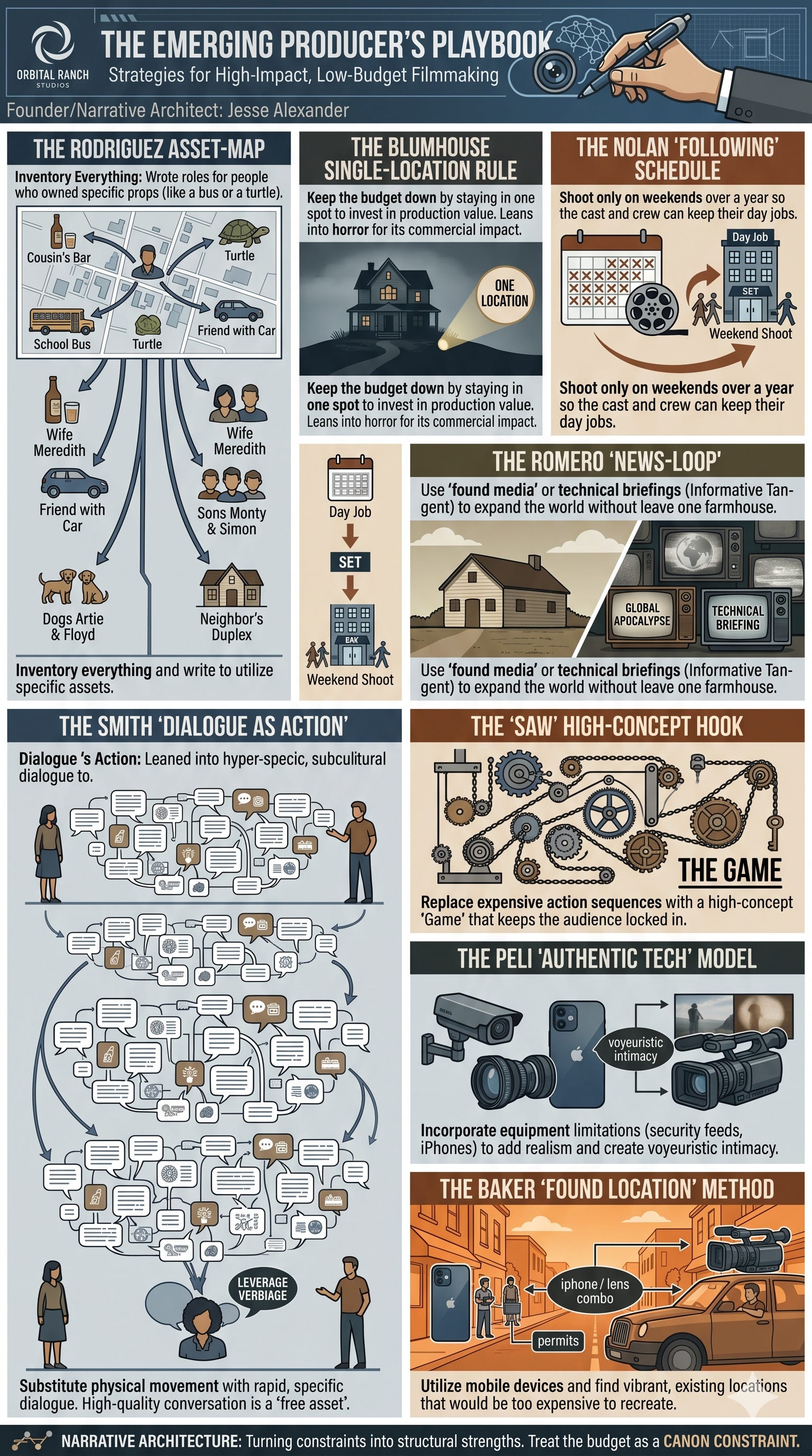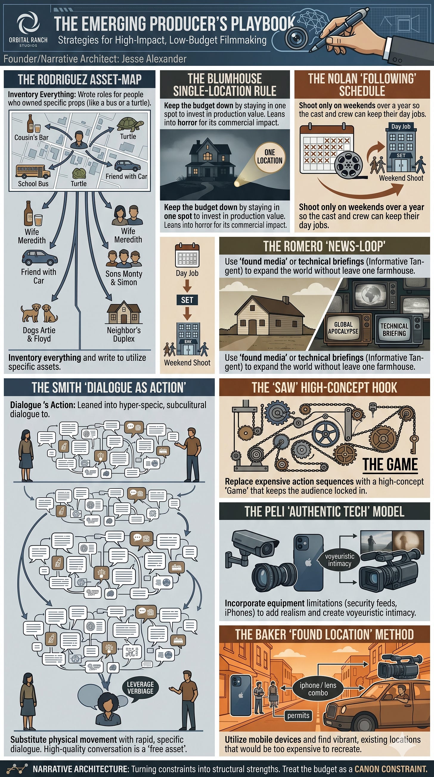 The Model: Robert Rodriguez (El Mariachi) famously looked at what he had—a local bar, a school bus, a turtle, and friends. Then scribbled a script that required those specific elements.
